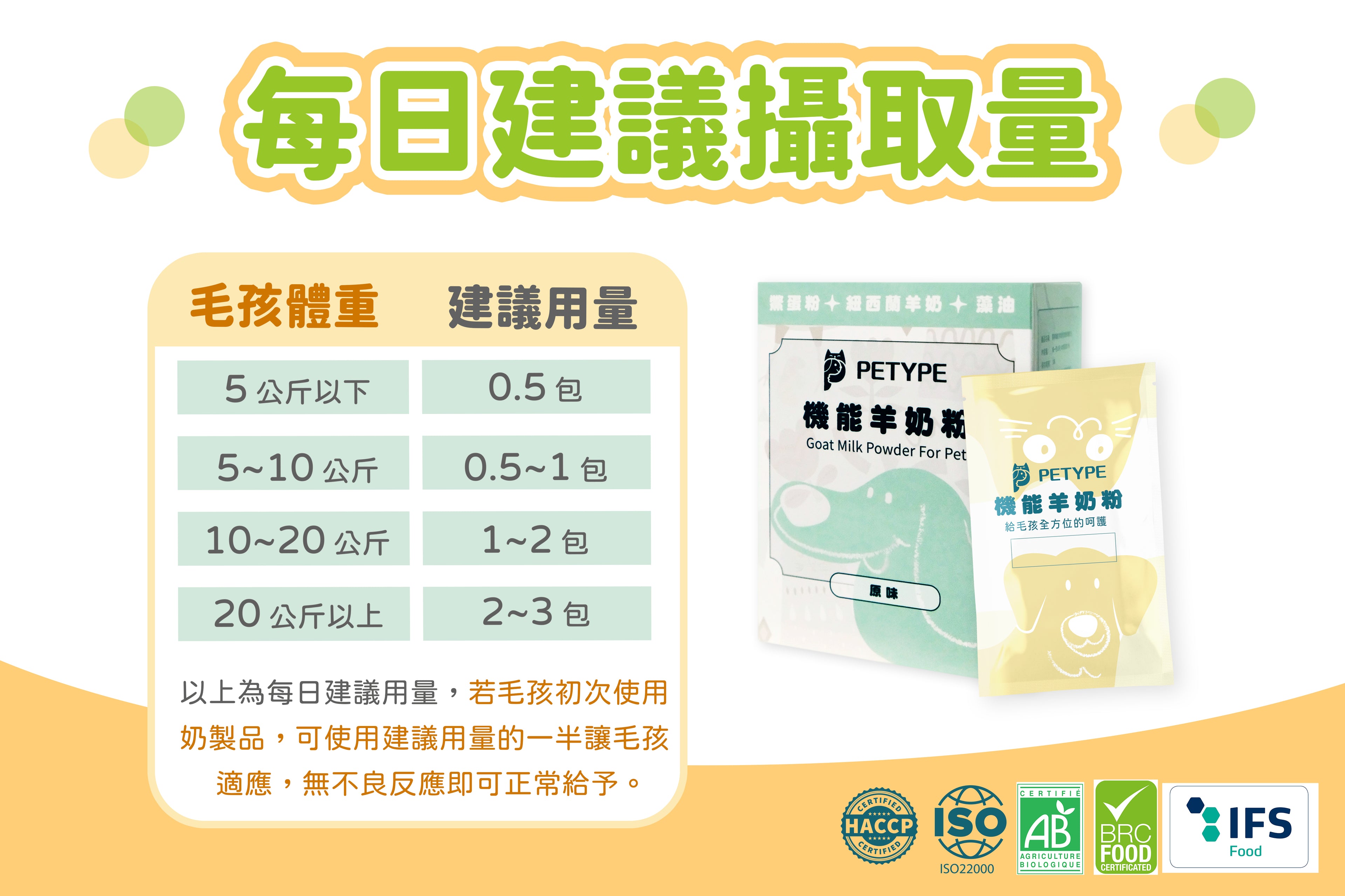 Q:毛孩一天可以吃多少PETYPE® 機能羊奶粉呢?